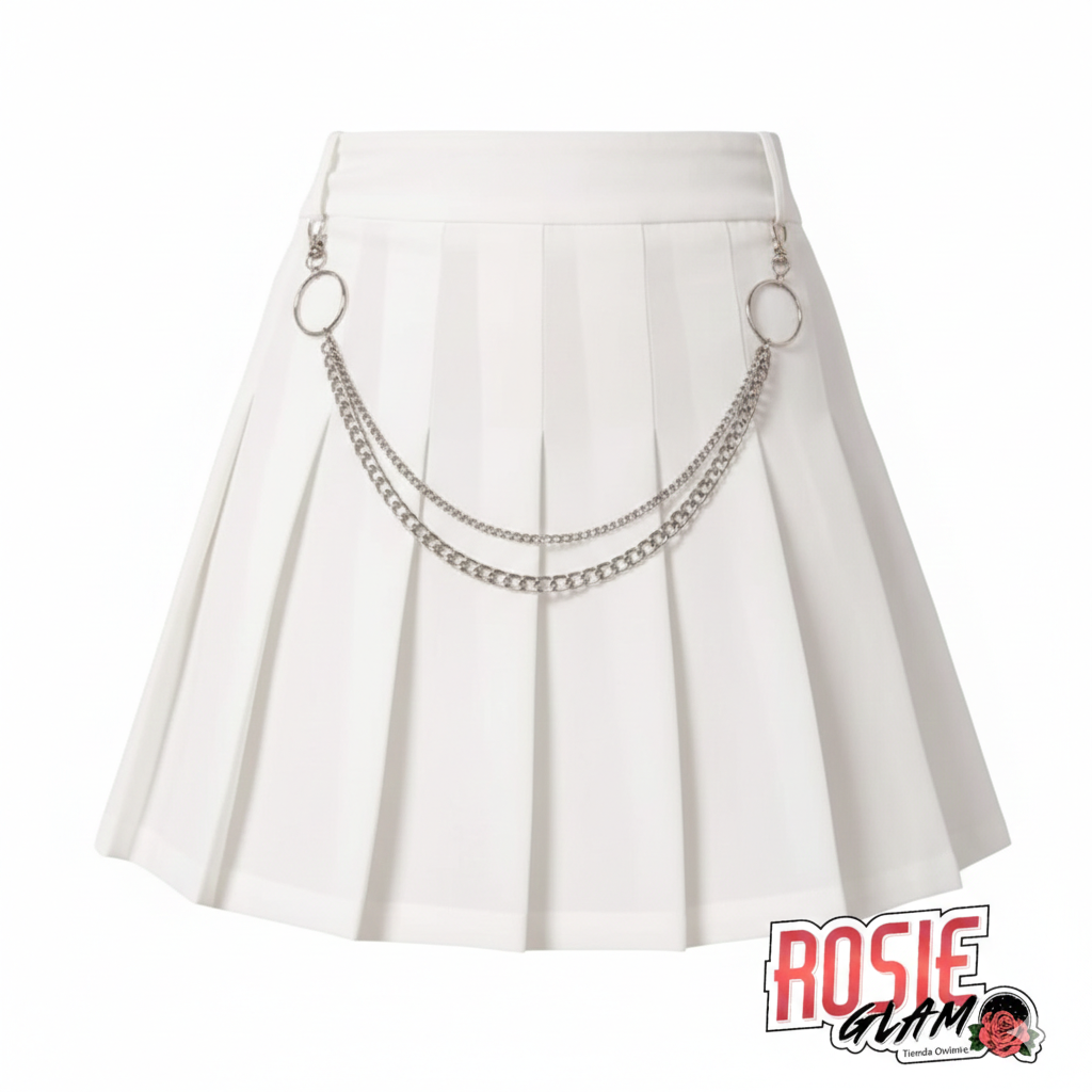 En primer lugar, la Falda Blanca Plisada con Cadenas de RosieGlam es la pieza definitiva para quienes buscan un estilo que navega entre la pulcritud de la tendencia preppy y la rebeldía del streetwear alternativo. Efectivamente, con su tono blanco impecable y el llamativo detalle de doble cadena metálica, esta prenda ofrece un aire audaz y sofisticado que nunca pasa de moda. Por consiguiente, diseñada para ser la protagonista de tu outfit, es la falda ideal para expresar tu personalidad con autenticidad y un toque de actitud punk-chic.