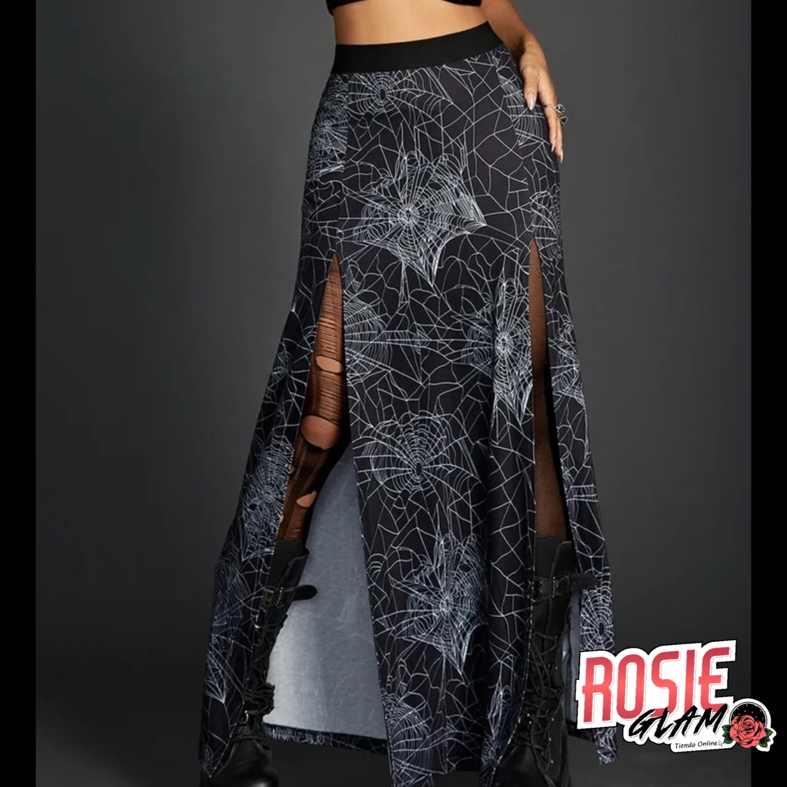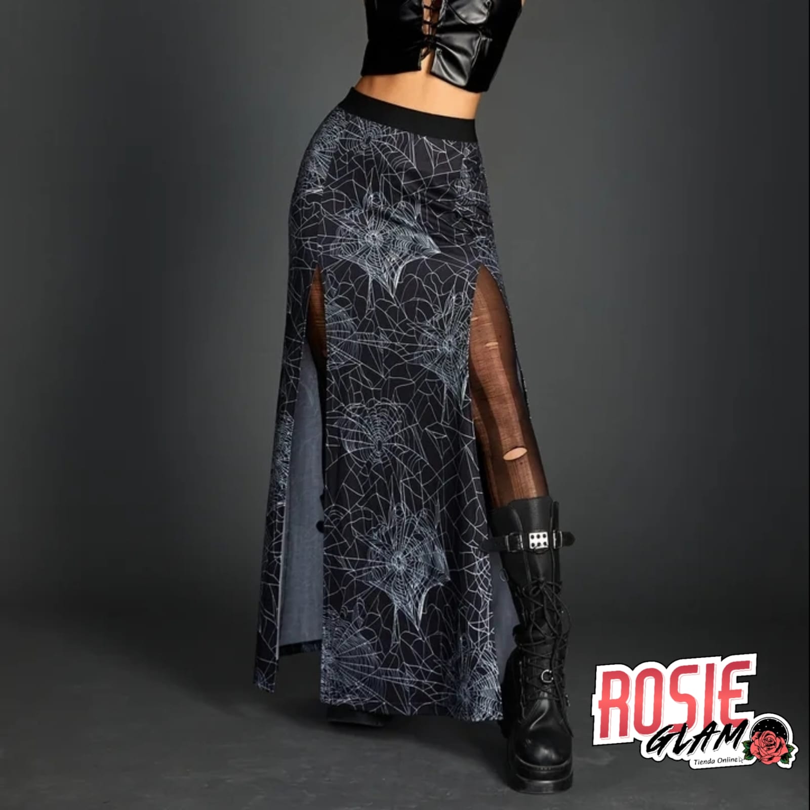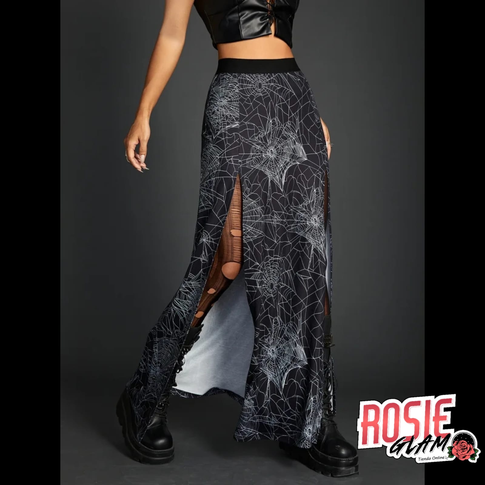 Diseño: Estampado de telarañas exclusivo con doble abertura frontal, ideal para quienes buscan un estilo gótico y alternativo con mucha personalidad.