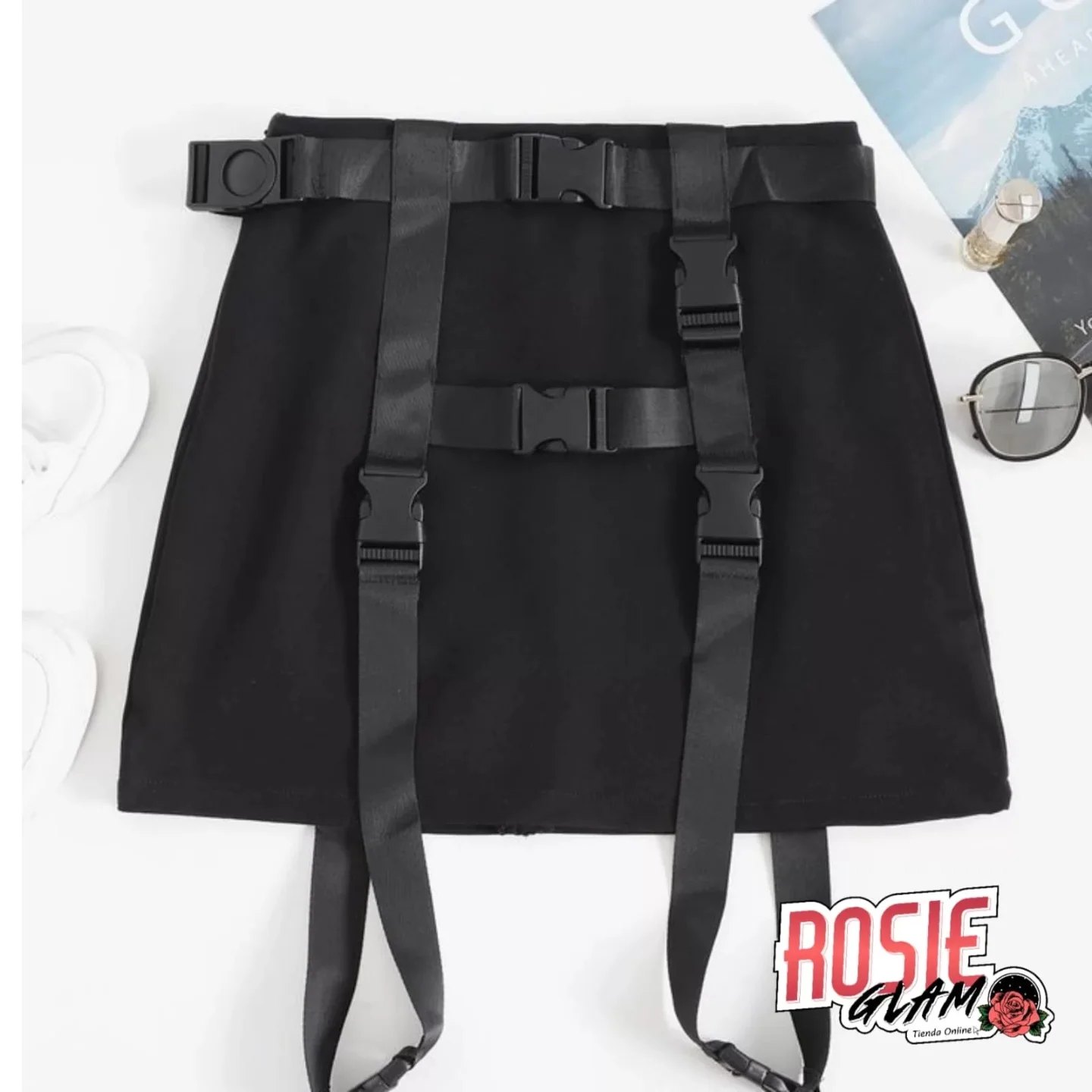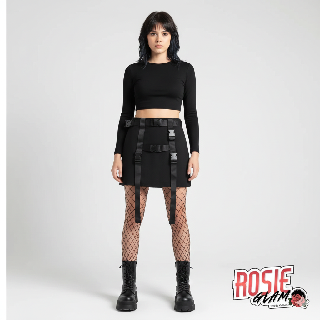 Diseño de Correas de Riata: Efectivamente, las cintas ajustables y las hebillas tácticas aportan un toque industrial único, lo cual eleva una falda básica a una pieza de diseño con estética darkwear.