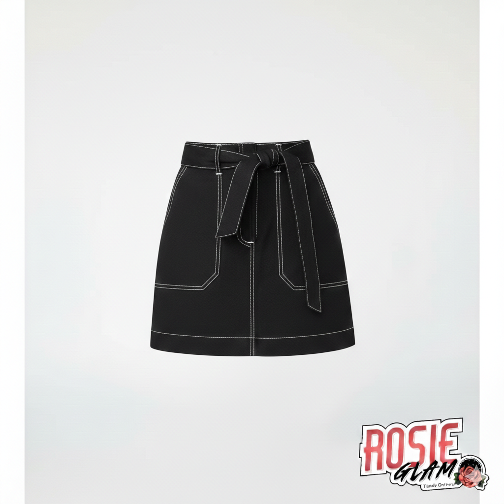 Detalle de Costuras en Contraste: Efectivamente, los pespuntes blancos sobre el fondo negro aportan un toque de diseño único, elevando una falda básica a una pieza de alta tendencia visual.