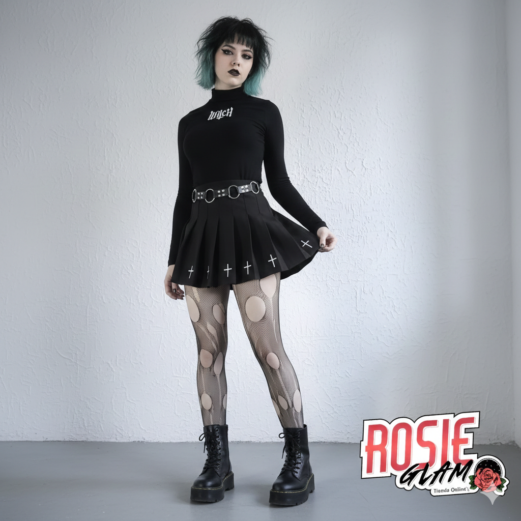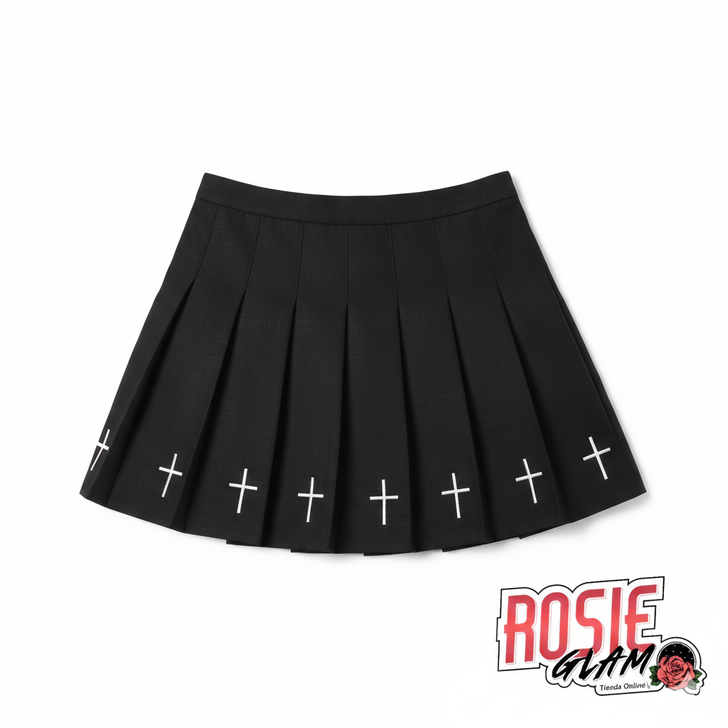 Diseño: Bordados de cruces en contraste y estilo plisado, perfecto para quienes buscan una estética gótica, alternativa y original.