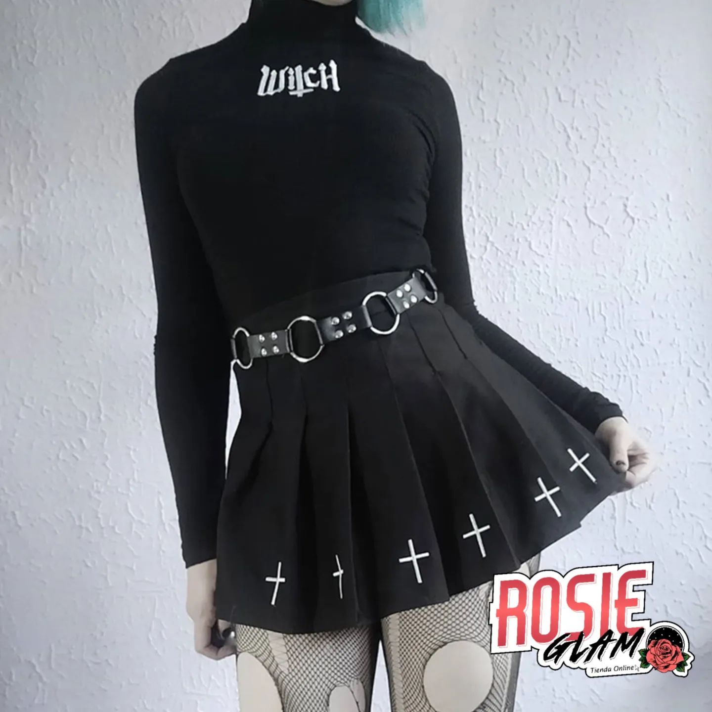 La Falda Negra Plisada Bordado Cruces de RosieGlam es la pieza definitiva para quienes buscan un estilo que navega entre la fuerza de la tendencia gótica y la sofisticación del dark academia. Con su negro profundo y los bordados de cruces blancas en contraste, esta prenda ofrece un aire rebelde y elegante que nunca pasa de moda. Diseñada para ser la protagonista de tu outfit, es la falda ideal para expresar tu personalidad con autenticidad y un toque alternativo.