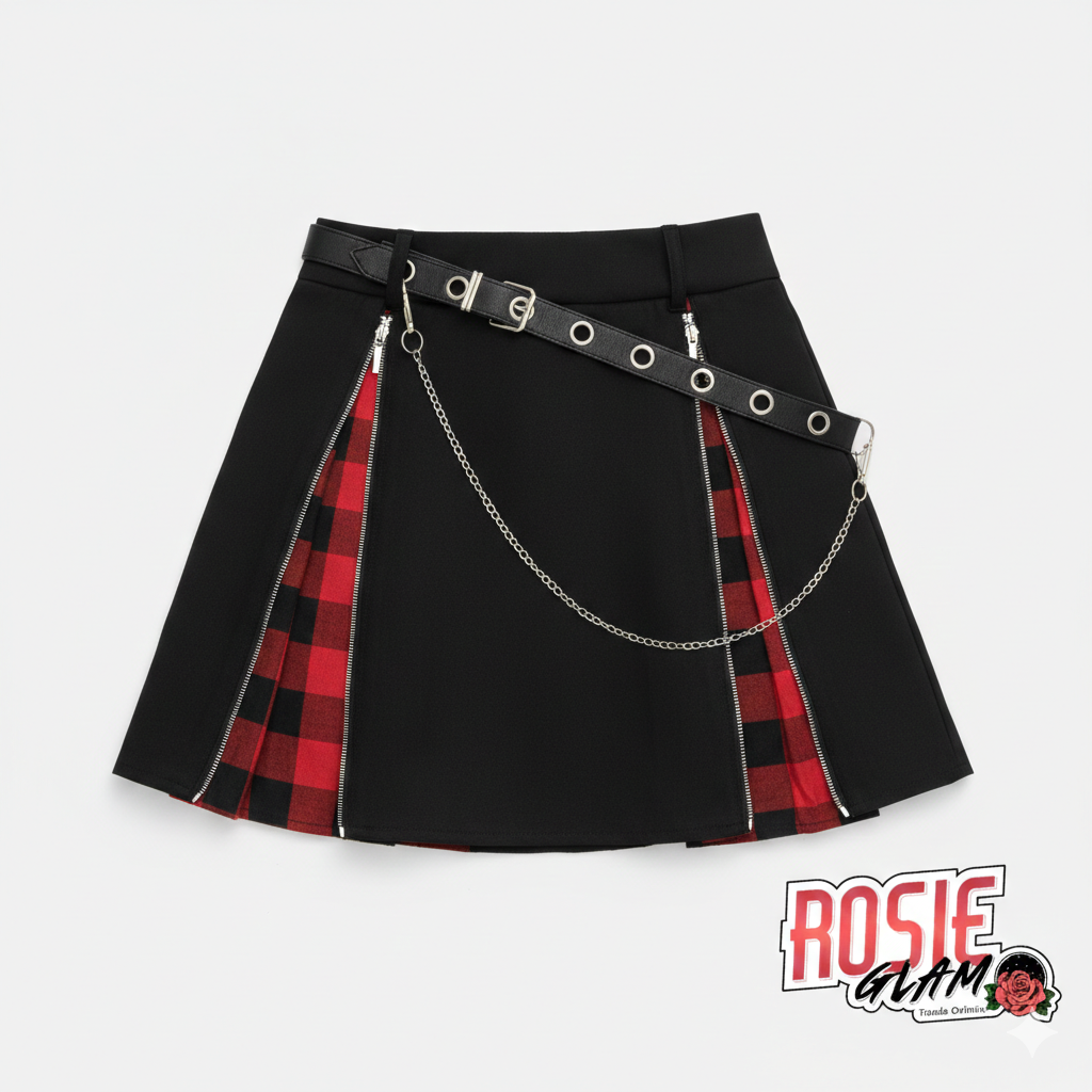 Detalles de Cremalleras y Cuadros: Los cierres frontales y los paneles de tartán rojo añaden una textura visual dinámica, elevando una falda básica a una pieza de diseño con estética aesthetic.