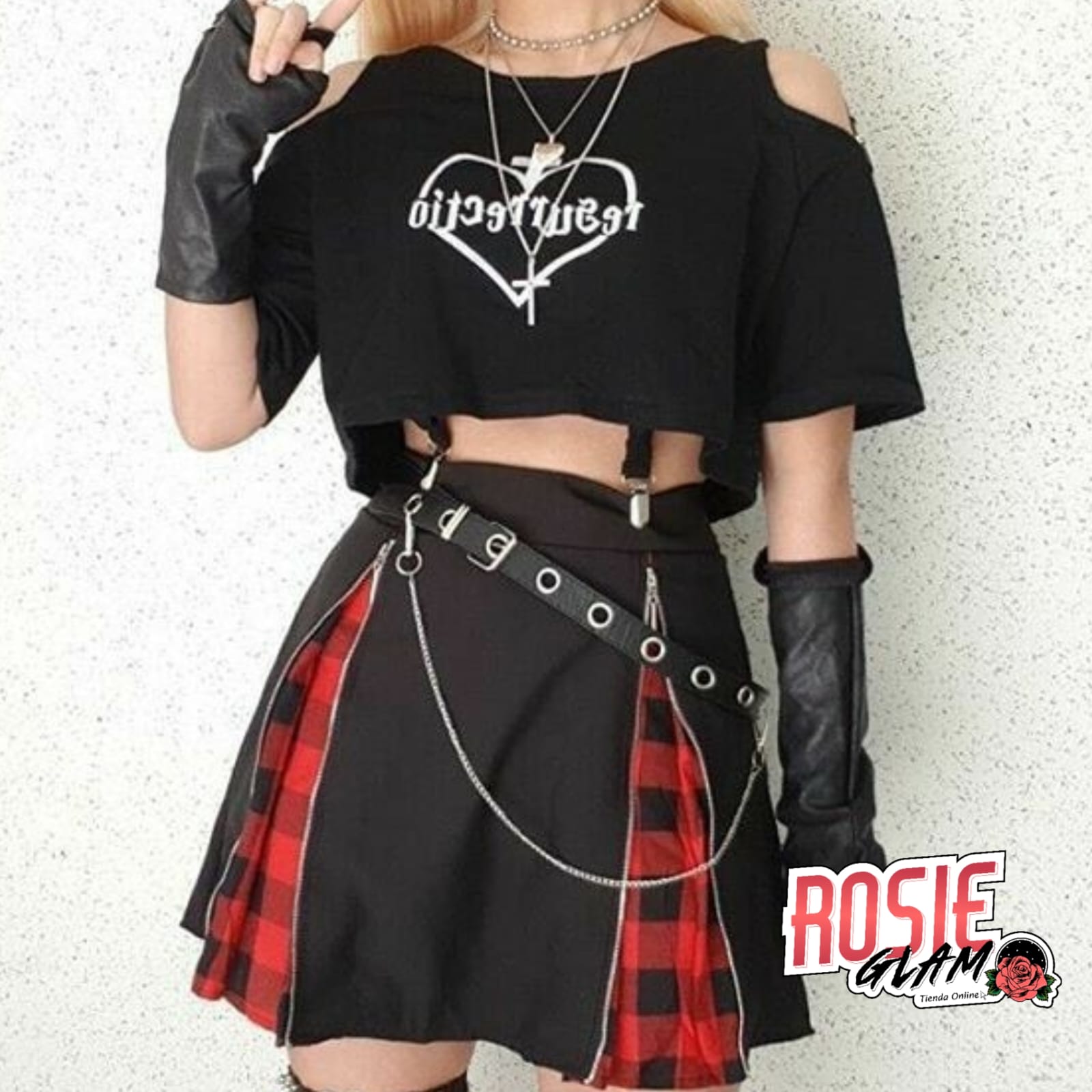 La Falda Negra con Prenses a Cuadros y Cremalleras de Rosie Glam es la pieza definitiva para quienes buscan un equilibrio perfecto entre la rebeldía del estilo grunge y la sofisticación del streetwear alternativo. Con su diseño audaz que integra cremalleras metálicas y paneles en contraste de cuadros rojos, esta prenda ofrece un aire punk y moderno que nunca pasa desapercibido. Por lo tanto, ha sido diseñada para ser la protagonista de tu outfit, siendo la falda ideal para expresar tu personalidad con autenticidad y seguridad.